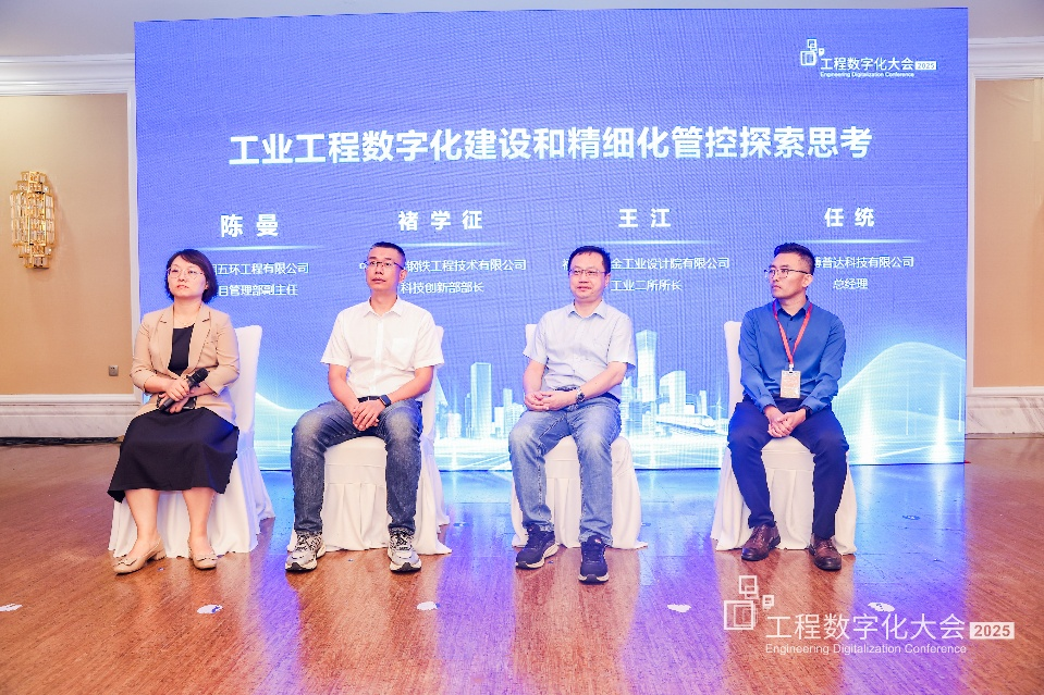 圆桌环节,中国五环工程有限公司项目管理部副主任陈曼、中冶南方钢铁工程技术有限公司科技创新部部长褚学征、福建省冶金工业设计院有限公司工业二所所长王江、成都博普达科技有限公司总经理任统,就《工业工程数字化建设与精细化管控的探索思考》为议题,展开了深度的讨论与分享。